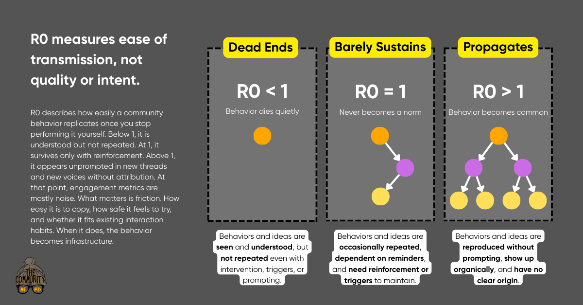 From a behavioral perspective, R0 lives in friction. How easy is it to do the thing once you have seen it done? Does it feel safe to imitate? Does it fit inside existing conversational habits, or does it demand a personality transplant?